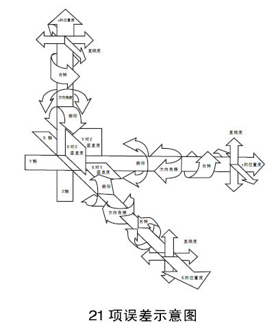 21項誤差是三坐標的基本幾何誤差,為了保證其滿足示值誤差及探測誤差的要求,三坐標廠家都要測量和控制這21項誤差,必要時進行補償