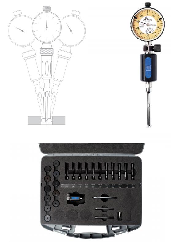 專為從0.47到12.6mm的小孔測量設計的孔徑量具,通過一點測量,不但能測量尺寸而且可以判定形狀偏差,具有出色的重復性。此類測量工具具有可互換的測量頭,內部有針形桿和夾持桿,它帶直徑為8mm的安裝孔,可安裝指示表或其它傳感器。